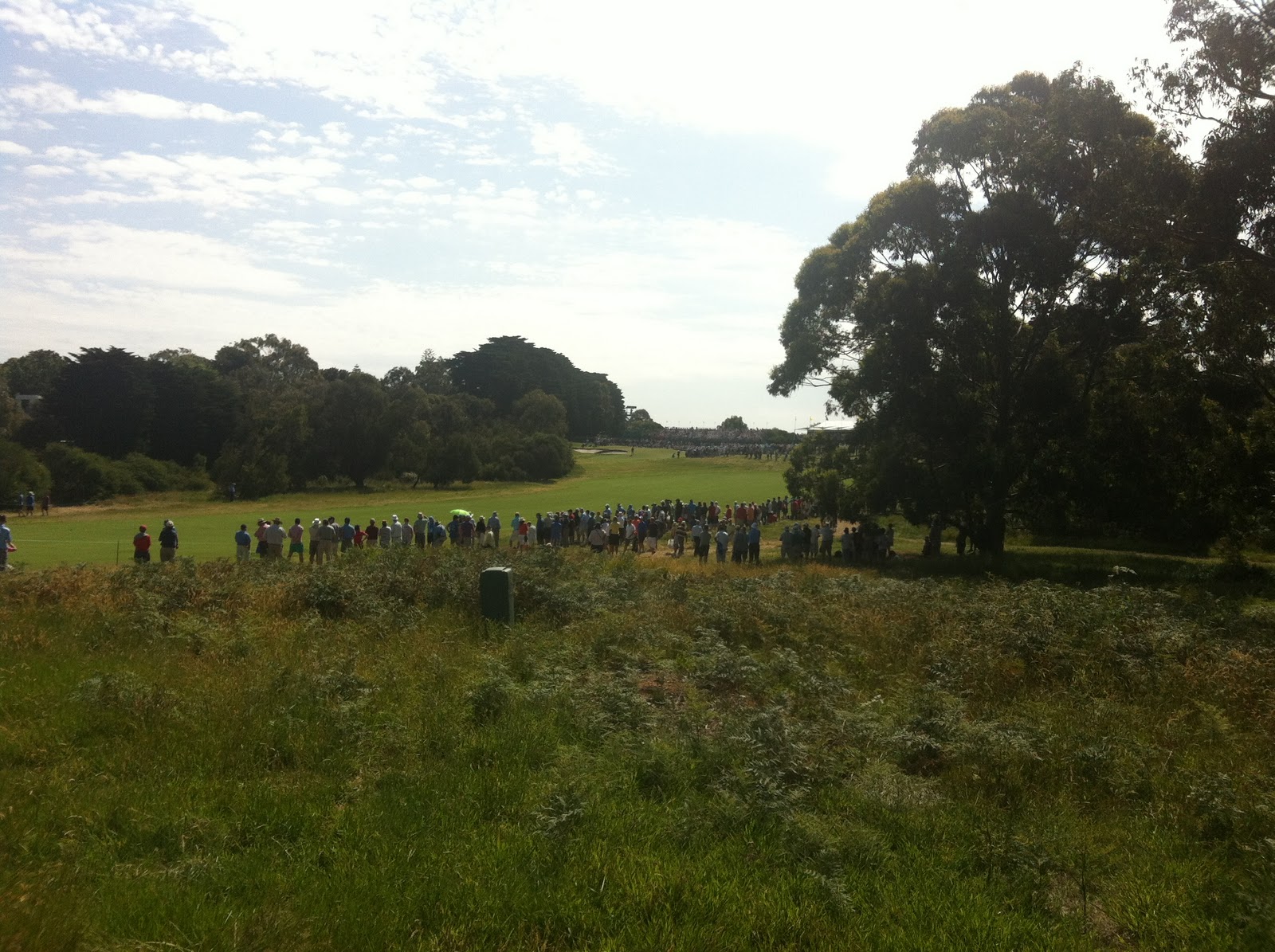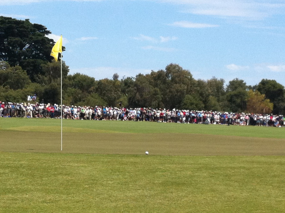 | Huge crowds line the 12th hole, looking back towards the 11th green. |